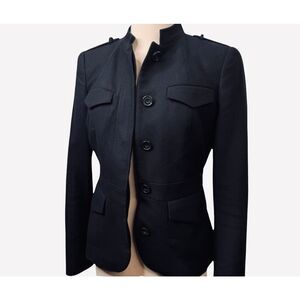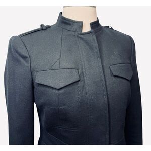 Beautifully tailored banana jacket, cre neck, front hidden buttons, military style, stretch wool, beautiful hemlines for max flatter on any figure