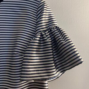 Dress is navy and white striped, but the fabric is a shiny, satiny look so white looks almost silvery.
