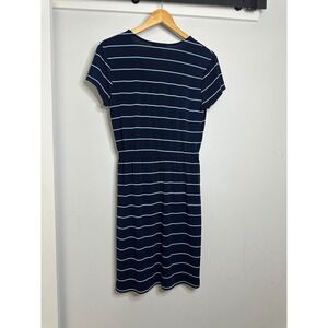 Keywords: Banana Republic, striped dress, navy blue, white, short sleeve, V-neck, faux wrap, elastic waist, casual dress, women's dress, medium, summer dress, spring dress