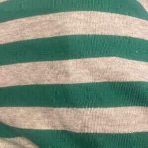 It features a flattering scalloped neckline and a classic green and white striped pattern.