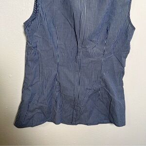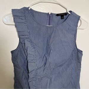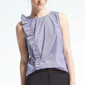 Great condition, minor wash wear. Banana Republic. Striped side ruffle blouse. Sleeveless. Blue with white stripes. Invisible back zipper. Asymmetrical ruffle. Size 2. Stretch 96% cotton, 4% spandex. Pit to pit laying flat 16” shoulder to hem 23”. All measurements are approximate and taken lying flat. Smoke free home. No trades, offers welcome.