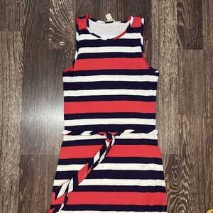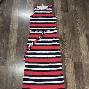 Elevate your style with this chic sleeveless maxi dress. Featuring bold red, white, and blue stripes, it's perfect for any occasion. Enjoy a comfortable fit and a flattering silhouette. Size small. Note some small markings in pictures.