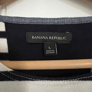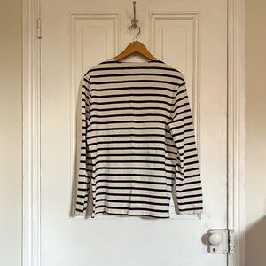 A lightweight, 100% cotton sweater in excellent condition. The stripes are navy blue. Size large.