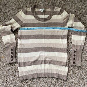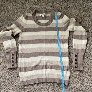 Ivory, tan and taupe striped sweater. Wide rib sleeve cuffs with buttons. Excellent used condition. Super soft, no holes, snags or pilling.