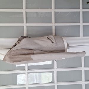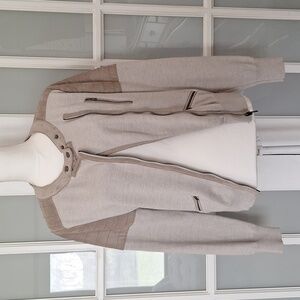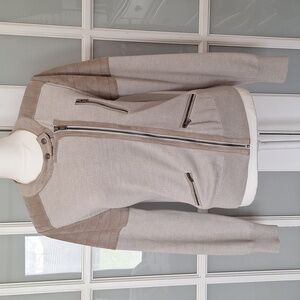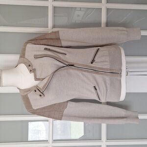A new take on the sweater jacket: our moto-inspired style, finished with quilted faux suede, snap-tab collar and long sleeves. Asymmetrical zip closure and 3 usable front zipper pockets. Color is Soapstone Heather (Taupe like color)