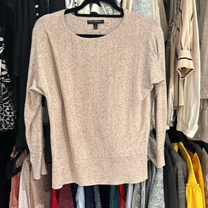 Cozy boatneck sweater with side skits and barely multi toned fabric. Love it.