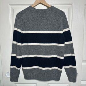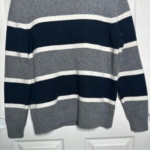 This Banana Republic women's sweater in size medium features a classic striped pattern in a tight-knit fabric, with a crew neck and long sleeves. Made from a blend of polyester, spandex, cotton, and acrylic, it has a preppy and eco-friendly design suitable for various occasions such as casual outings, workwear, or parties. The sweater is machine washable and offers a regular fit with stretch for all seasons. Perfect for adding a touch of style to your wardrobe while staying comfortable and chic. Preppy, coastal, coastal grandma, casual, color block, fall, autumn, winter themed.