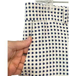 Add a touch of pattern play to your wardrobe with these Banana Republic Hampton fit cropped dress pants, size 8, featuring a classic navy blue polka dot print on a crisp white textured cotton blend. Fully lined for comfort and structure, these tailored trousers offer a straight-leg silhouette, side pockets, and a 28" inseam—perfect for office edits, minimalist capsules, or dopamine dressing with a graphic twist.