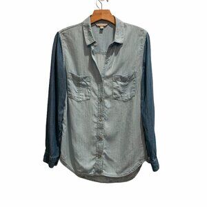 Two-tone Chambray Button Front Shirt two front pockets, silver buttons curved hem.