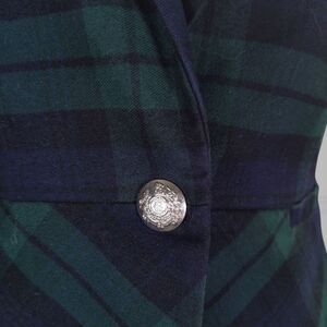 Long sleeve one button peplum blazer in a Tartan plaid, notched lapel, embossed crest metal button, fully lined, no shoulder pads, stretch woven fabric but will not stretch to size up, for ease of wearing only.