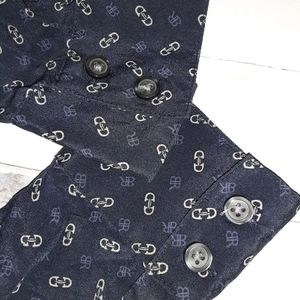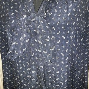 Navy blue and tan tie-neck top. There's a slight ruffle look on the top shoulders. Slightly worn in great condition.