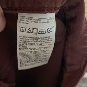 Experience the perfect blend of style and comfort with these Banana Republic slim-fit jeans in a striking maroon color hue. Crafted with a velvet-like texture, these jeans offer a modern and sleek silhouette. Ideal for adding a pop of color to your wardrobe.