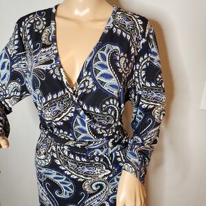 Banana Republic True Wrap Navy Paisley Long Sleeve Knee Length Stretch Dress. XL