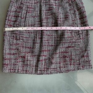 High waisted. Fitted through the waist, slight A-line through the hips. Woven tweed skirt. Fully lined. Invisible back zip closure. 2 front vertical pockets See photos for details