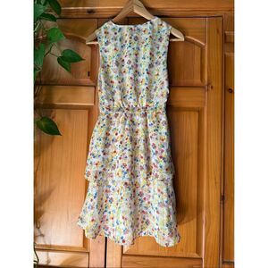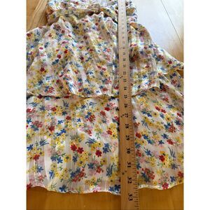 Double Ruffle Floral Mini Dress. Dress is lined and comes with a side zipper. Has elastic in the back of the waistband for a better fit. Please see photos for idea on measurements.