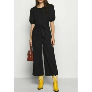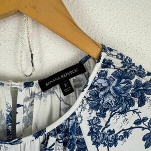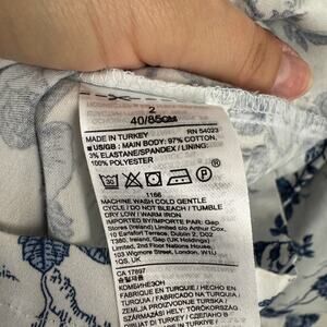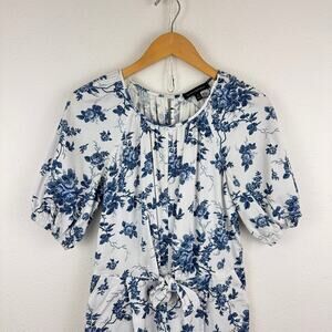 White & blue floral toille, soft cotton poplin, twist front, pockets, lined, cropped leg, zip back, size 2.