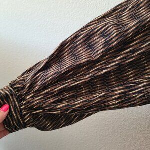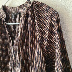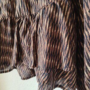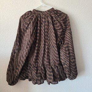Excellent used condition US women's size XS Banana Republic 100% cotton brown vertical striped flutter hem detailing long sleeve blouse. Approximate measurements have been provided in photos for fit. No major flaws to note.