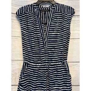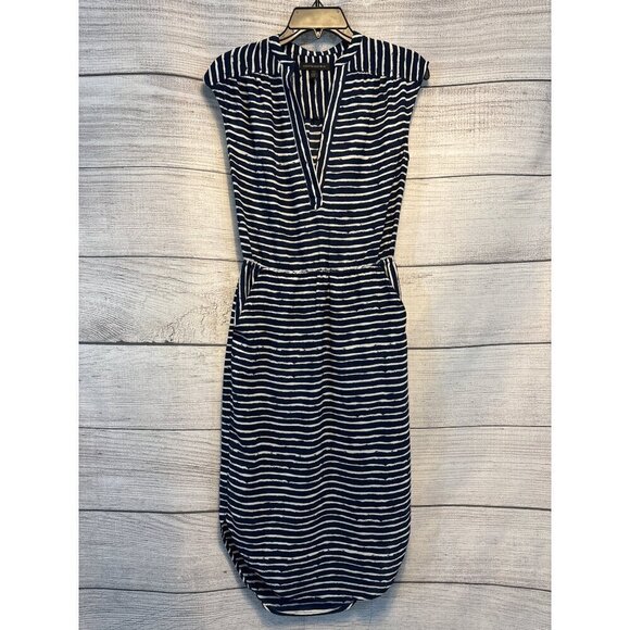 This Banana Republic V Neck Striped Pocket Dress is a must-have for any fashion-forward wardrobe. Perfect for both casual and formal occasions, this dress features a classic striped pattern and convenient pocket design.