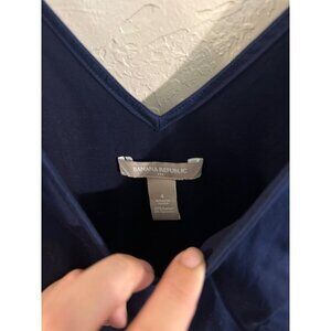 Sleeveless dark blue v neck mini dress with a pleated bottom by Banana Republic. See pics for more details. Ask me about my bundle discounts! Keywords: Party, unique, business casual, date night, staple piece, basic, wedding guest, dance party, formal, dinner, festival, chic. Very gently used, great condition, no damages or fabric wear. Bust: armpit to armpit measured laying flat is 17 in across Length: 36 in Women's size 4.