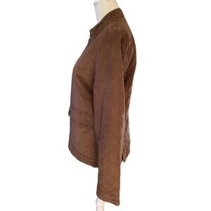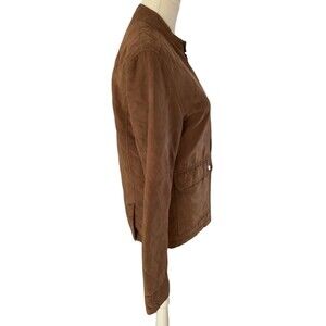 Rev up your wardrobe with this stylish and versatile Banana Republic Vegan Suede Moto Jacket in a beautiful camel brown color. This jacket features a zip closure, side vent snaps, and pockets for added convenience. The quilted accents add a touch of edgy style, making it perfect for travel, casual outings, or workwear.