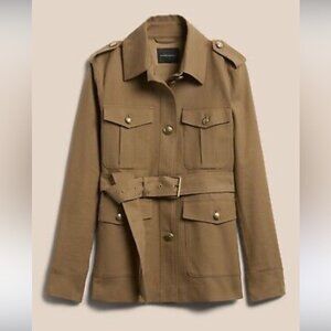 Banana Republic Voyage Belted Trench Jacket Khaki Inspired by vintage safari styles, this expertly tailored blazer adds a luxurious twist to an exploring essential with a beautifully soft and sumptuous organic cotton twill. Plus, includes plenty of pocket space to save you from carrying extra bags. WARM: Lightly lined through the body for easy layering through the seasons. SEMI-FITTED: Cut for a not-too-tight, not-too-loose fit. Point collar. Button front closure. Belted waist with buckle and belt loops. Front and chest patch pockets with button closure. Shoulder epaulets. Center back pleat. Center back vent. Wrist cuffs with double button placket. Fully lined. New with tags. A few faint spots shown in photos Measurements are taken flat and are approx Pit to pit 23” Length 29”