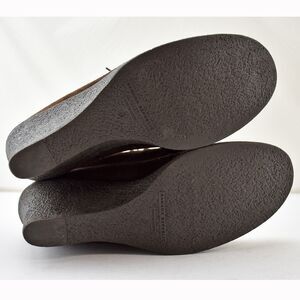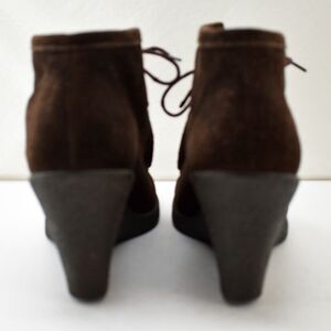 Banana Republic women's size 9-1/2 suede wedge heel booties are in excellent condition. Brown suede leather upper with three eyelet lace-up. Clean padded insole, rubber soles.