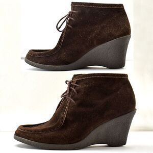 Banana Republic women's size 9-1/2 suede wedge heel booties are in excellent condition. Brown suede leather upper with three eyelet lace-up. Clean padded insole, rubber soles.