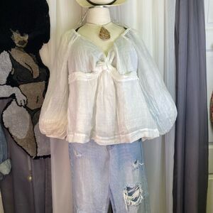 This chic white blouse with puff sleeve is 100% linen is a summer dream. Features a stylish front mock tie detail, full smock back for added comfort, and voluminous puff sleeves with gathered elastic cuffs. Flowy and breathable, perfect for warm weather days.