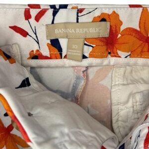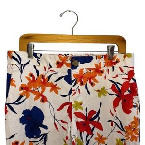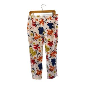 A skinny pair of slacks in a bright white color with a fun floral print pattern. 98% cotton, 2% spandex. Made in Sri Lanka.