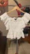 Chic white blouse with smocked bodice. Features ruffled sleeves and hem. Perfect for a stylish look.