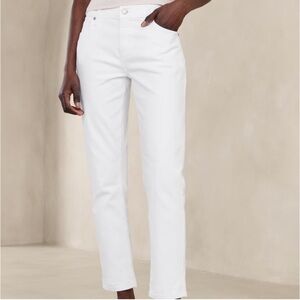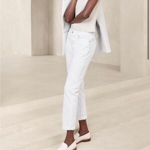 These Banana Republic Girlfriend jeans size 29/8 feature a clean white color and a timeless straight leg cut, making them a versatile addition to any wardrobe. Crafted from high-quality denim, they offer a classic look suitable for various casual occasions. They are in perfect condition! No stains or flaws!
