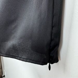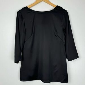 Features: Banana Republic 3/4" sleeve blouse with high front neckline and cowl back neckline. Side zipper closure. Black poly satin stretch fabric.