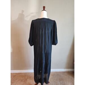 Black Pleated Women's Dress. Puff Sleeves. Deep V-Neck. Maxi Length. Sheer. Missing Belt. In good preowned condition. Smoke free home.