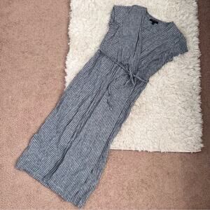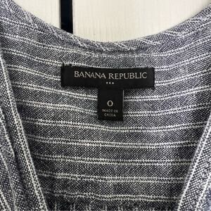 This Banana Republic dress is blue and white striped and made of a linen blend. It is a size 0 and has been previously owned. It is in good used condition