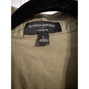 ** Please see photo tiny area pilling in front a little mark on front This Banana Republic Women's Button-Down Dress in olive green, size L, is a stylish and versatile piece made from a linen blend. It features a collared neckline, short sleeves, and a belted waist for a flattering silhouette. The knee-length shirt dress is perfect for casual occasions during the warmer seasons, with a solid pattern and button accents adding a classic touch to the design. Additionally, the dress is machine washable and includes pockets for added functionality.