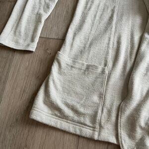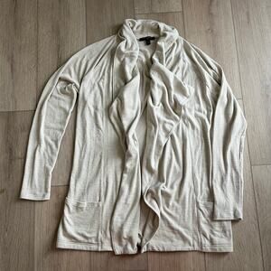 Description: Cream colored cardigan with patch pockets and a waterfall style front. Lot's of stretch.