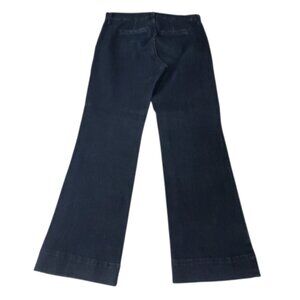 The Banana Republic Women's Dark Wash Denim Trouser in Petite size 28/6 features a solid dark wash design with a high-rise waist and a flared fit. Made from a blend of polyester, spandex, and cotton, these jeans have a regular fit and stretch for added comfort. The trousers have a zip and button closure, pockets, and are machine washable. Perfect for all seasons, these stylish jeans are a versatile addition to any wardrobe.