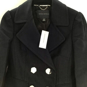 Very Nice NWT Banana Republic double breasted blazer jacket. Great for office or just a good layering piece. Features two front flap pockets, light shoulder padding, double breasted, silver hardware & fully lined.