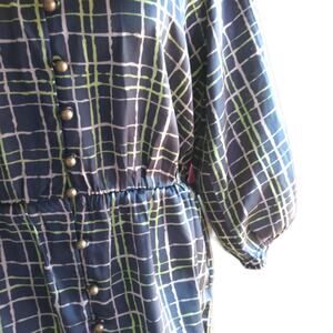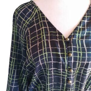 Banana Republic women’s tunic blouse, size Small. Vintage-inspired Holiday 2012 piece in navy blue, lime green, and steel gray geometric plaid. Relaxed boxy silhouette with V-neckline, bronze pearl-look buttons, and airy 3/4 sleeves with elastic band. Lightweight 100% polyester, easy layering for work or weekend. Great indie / artsy vibe with a quiet preppy undertone.