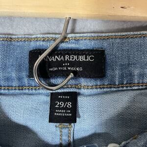 The product is a pair of Banana Republic Women's High Rise Wide Leg Button Fly Jeans in size 29/8 Petite. These jeans feature a zip and button closure, denim fabric, a high-rise waist, a wide-leg style, a 5-pocket design, stretch fabric, and a 27.5-inch inseam. The jeans are designed for petites and are machine washable. Made of a blend of polyester and cotton, these stylish jeans are perfect for the seasons of winter, fall, and spring. The classic blue color and solid pattern make them a versatile wardrobe staple.
