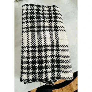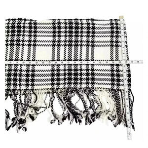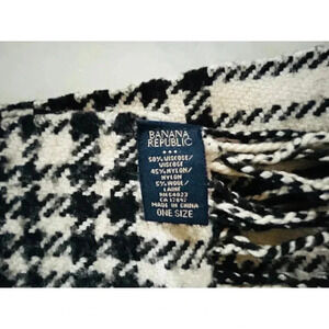Pre-owned Banana Republic scarf. The scarf is made of a blend of 50% viscose, 45% nylon, and 5% wool. It features a black and white houndstooth pattern and has fringe edges. Measurements are approximately 72”x 12”The scarf is in excellent condition with no visible imperfections