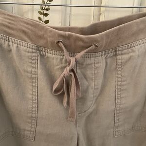 Women's Banana Republic khaki shorts in size 4. These casual shorts feature a tie front and an elastic waist for a relaxed fit. Made of a linen and cotton blend fabric, they have a solid beige color with pockets. Ideal for travel or casual wear in the summer or spring season. The inseam is 5 inches, and they have a mid rise waist of 34 inches. Machine washable for easy care.