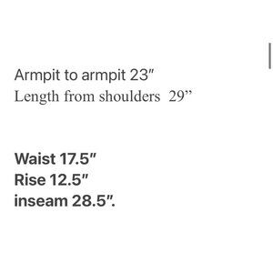No visible flaws. Measurements: Armpit to armpit = 23", Length from shoulders = 29", Waist = 17.5", Rise = 12.5", Inseam = 28.5".