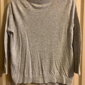 Womens Gray and multi color sweater. Front 100% polyester, neck, sleeves and back 100% cotton. Front small pattern is brown rose, white and blue. Good condition.