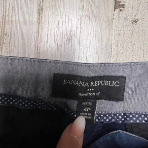 Banana Republic women's chino pants in size 4P, designed for petites. These blue pants feature a regular fit with a mid-rise and straight leg style. Made from high-quality stretch fabric, they include side and back pockets. Suitable for both casual and semi-formal occasions. Pre-owned. Keywords: Banana Republic, women's pants, chino, size 4P, petites, blue pants, stretch fabric, straight leg, mid-rise, side pockets, back pockets, casual wear, semi-formal wear.