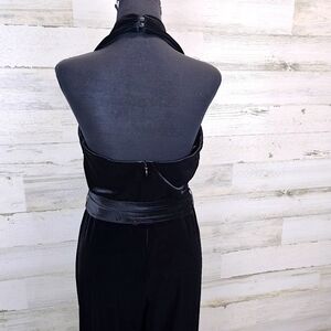 • Crafted from luxurious velvet, this chic piece features a sophisticated halter neckline, a flattering wide-leg cut, and a stylish belt to cinch your waist.