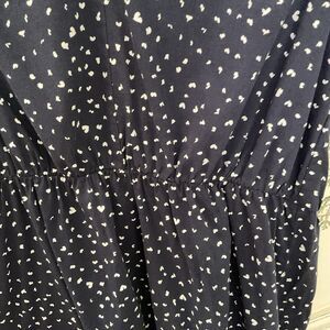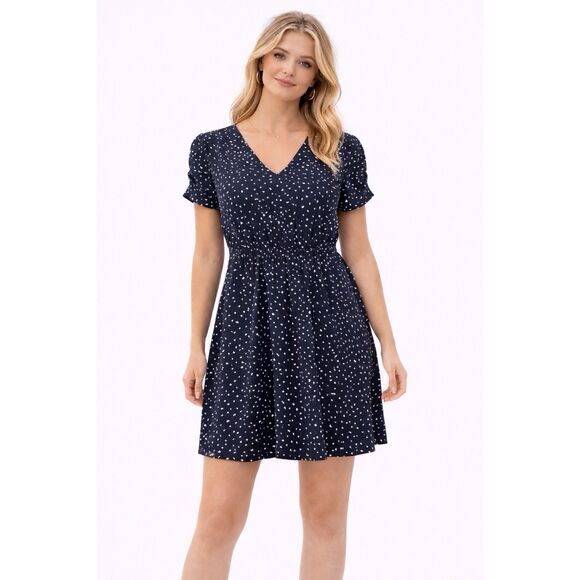 Banana Republic navy dress with an allover white heart print. Flattering V-neck with short sleeves and a comfortable elastic waist that gives an easy fit-and-flare shape. Lightweight, soft feelgreat for everyday, date night, brunch, or work with a cardigan/blazer.