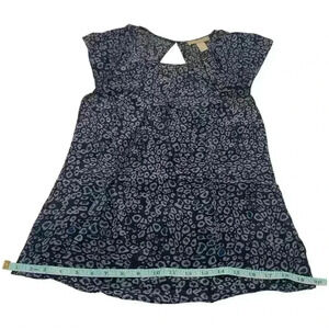 Lovely blue print silk blouse that’s lightweight and breathable feels amazing against one’s skin. A few great details such as flutter short sleeves, front pleats, loose fitting and a open back. This item is in excellent condition with only lights signs of wear, if any.