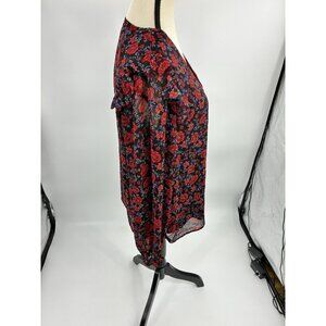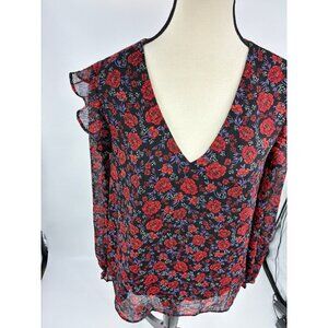 Banana Republic Womens Size M Black Red Floral V Neck Ruffle Sleeve Sheer Blouse
