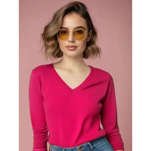 Keywords: Banana Republic, women's sweater, pink pullover, V-neck sweater, fitted sweater, merino wool, long sleeve, casual wear, professional attire, size S, pre-owned sweater, women's fashion, pink top, regular size, pullover sweater